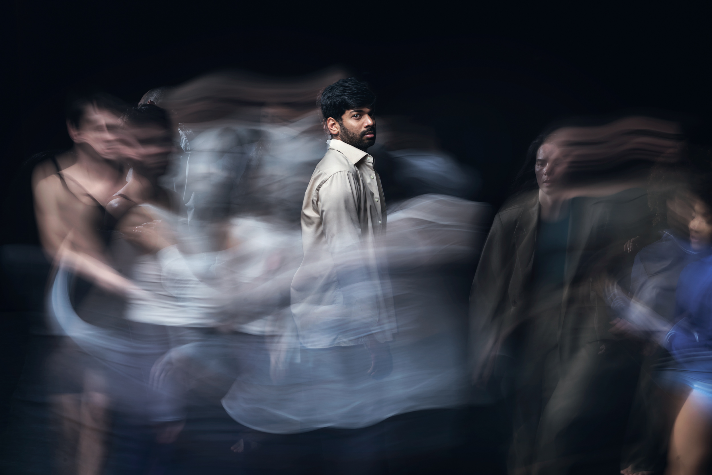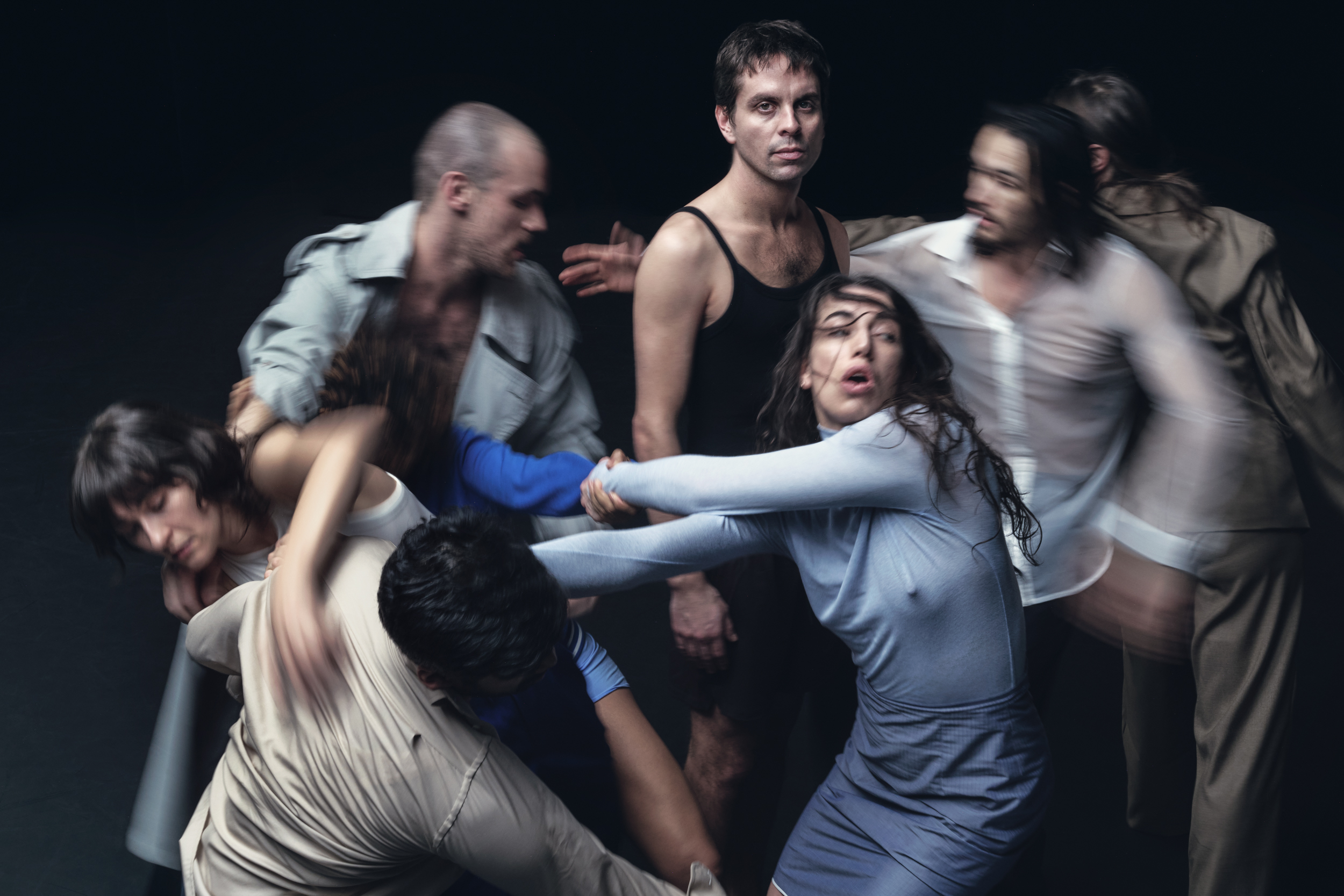 Flesh Chariots / Chariots of Flesh is a moving human mirage: posture, proximity, presence drip into one another like a wet painting reworked in real time. Separate yet together, fifteen bodies vibrate into scenes, dissolve into masses, collide in and out of coherence.